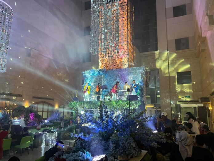 Surabaya, (pawartajatim.com) – Pergantian tahun 2024-2025, Surabaya Suites Hotel mengajak para tamu menikmati lantunan musik yang tak biasa. Tahun ini, mengusung tema bertajuk Ambyar (Shattered) dengan pilihan musik pop-dangdut yang memberikan keseruan atmosfer penuh warna, didukung dengan dekorasi mewah bernuansa biru dan ornamen kaca gemerlap menghiasi cafe taman sesuai dengan tema Shattered atau pecahan kaca.