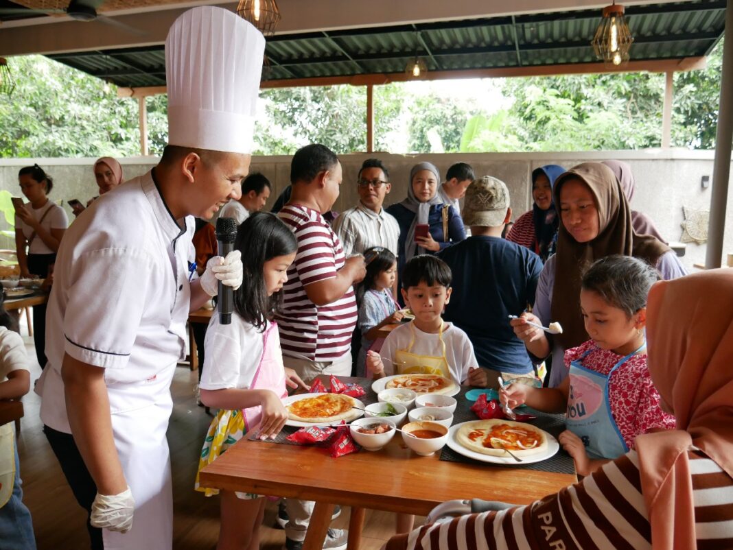 Kegiatan ini disambut sangat antusias oleh para peserta dan orang tuanya, tergambar dari raut wajah mereka yang ceria dan sesekali tersenyum sambil memperhatikan penjelasan dari Chef Agam. “Aku suka sekali makan pizza yang isiannya sosis dan sayuran, apalagi ditambah dengan saos sambal jadi lebih enak,” kata Kanaya, salah satu peserta cooking class.