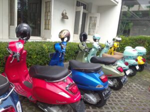 ‘’Waahh…., bagus yaaa vespa keluaran terbaru ini,’’ kata seorang pengendara yang kebetulan sedang selipan dengan rombongan pengendara yang menjajal kepiawaian Vespa Batik.