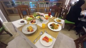 Menu utama terdiri dari pilihan Indonesia dan mediterania. Antara lain nasi briani kambing, gulai, nasi goreng, mie goreng, ayam goreng, aneka sayur, penyetan, macam- macam sambal, menu gubuk seperti rujak cingur, roti bakar, hidangan penutup berupa makanan kecil, kue-kue pilihan, irisan buah segar, dan aneka minuman baik panas, maupun dingin.