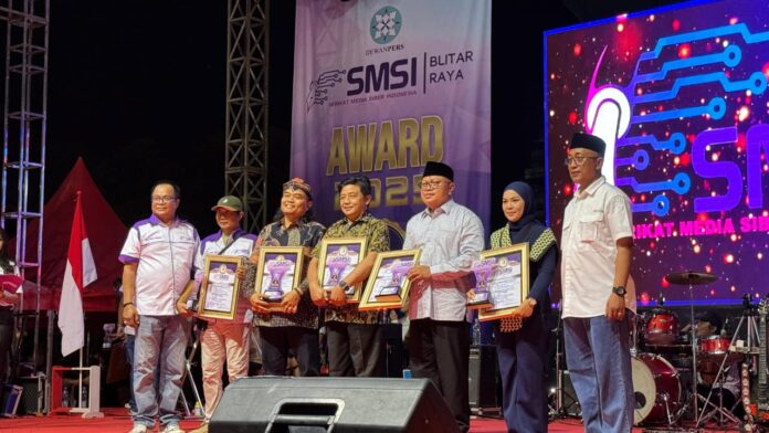 Blitar, (pawartajatim.com) – Pengurus Serikat Media Siber Indonesia (SMSI) Blitar Raya resmi dilantik. Pelantikan dikemas secara megah dengan penyelenggaraan Expo UMKM dan SMSI Award 2025. Acara semakin meriah dengan penampilan istimewa dari Cak Sodiq featuring New Monata, menghibur ribuan pasang mata yang hadir di Alun-Alun Pemkab Blitar, Sabtu (24/5/2025) malam.