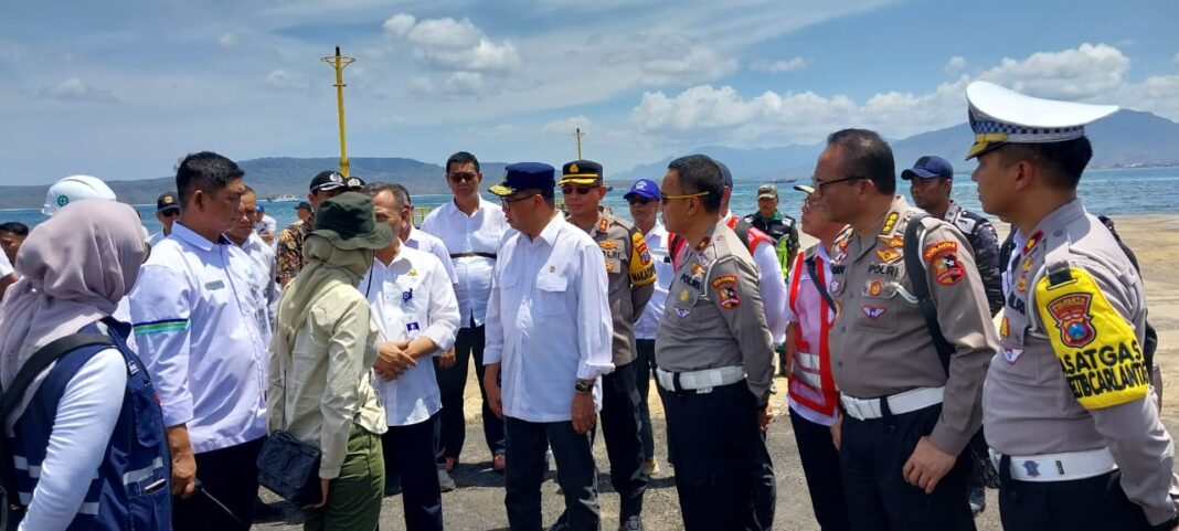 Banyuwangi, (pawartajatim.com) – Menteri Perhubungan (Menhub) RI, Budi Karya Sumadi, memantau kesiapan angkutan Natal dan tahun baru (Nataru) di Pelabuhan Ketapang, Banyuwangi, Sabtu (16/12/2023). Di pelabuhan lintas Jawa – Bali ini, Menhub melakukan pengecekan dari udara. Sebanyak 5 kapal tambahan akan dioperasikan di jalur penyeberangan selat Bali ini selama libur Nataru.