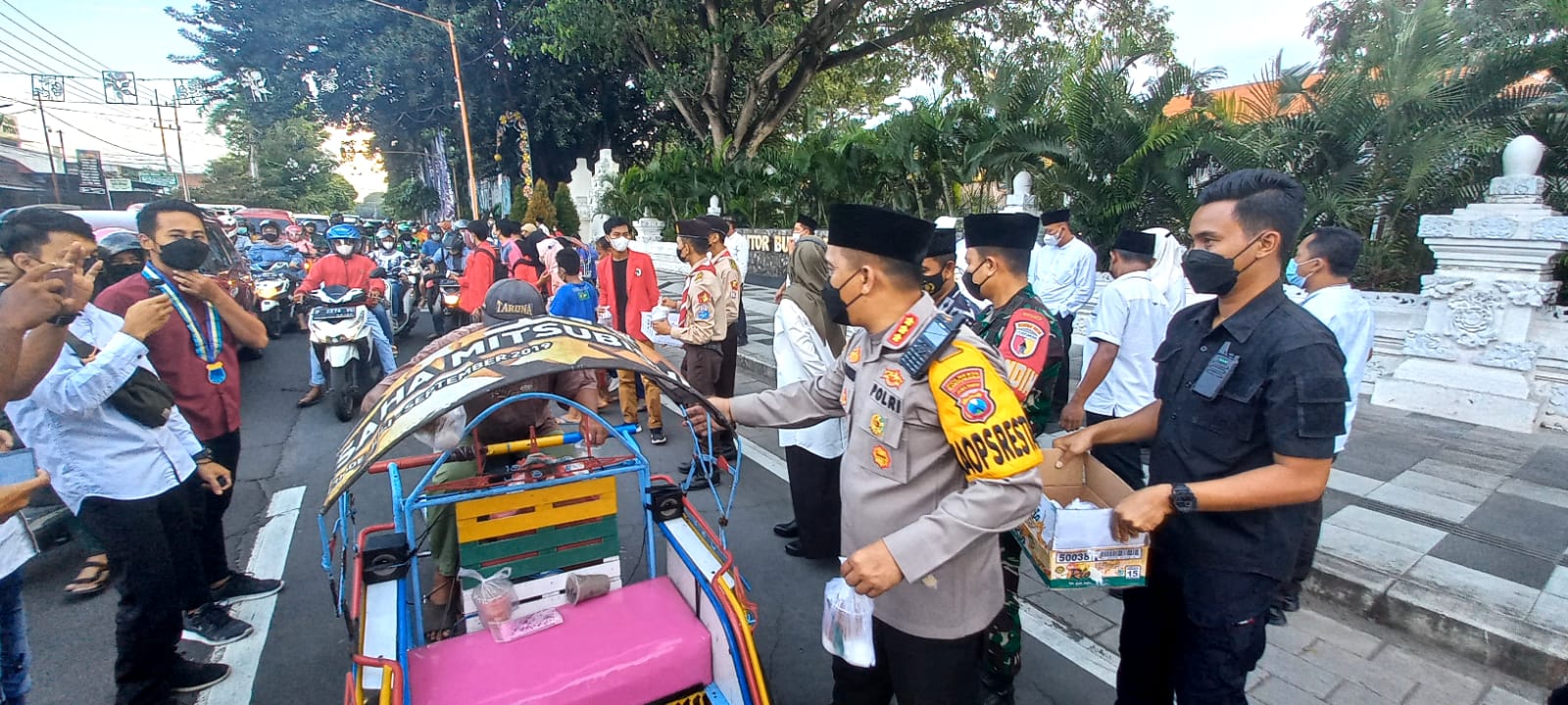 Banyuwangi, (pawartajatim.com) – Sedikitnya 10.000 takjil dibagikan secara gratis di jalan protokol depan Kantor Pemkab Banyuwangi, Selasa (12/4/2022) sore. Aksi ini digelar jajaran Forum Pimpinan Daerah (Forpimda) Banyuwangi bersama berbagai elemen masyarakat. Seluruh takjil dibeli dari para pelaku Usaha Mikro Kecil Menengah (UMKM) di kabupaten ini.