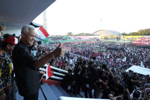 “Jangan pernah mau budaya kita diambil orang. Jangan pernah mau budaya kita digantikan dengan budaya asing karena kita punya kekayaan itu. Setuju? Itulah yang menjadi PR besar kita,” imbuhnya. Dalam kesempatan itu, Ganjar, menyampaikan salam dan cinta kepada ribuan relawan yang hadir.