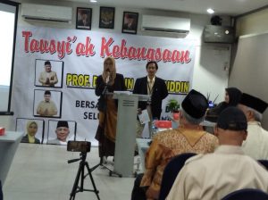 Sebelum Din Syamsuddin, menyampaikan ceramah kebangsaan, sejumlah pengurus Partai Pelita Jatim menyampaikan sambutan. Diantaranya, Ketua DPW Jatim, Nur Cholifah Anis, Motivator Partai Pelita Jatim, M Darwis Sornarto, S.IP., serta Ketua Panitia Penyelenggara ‘Taushiah Kebangsaan’, Yuli Astuti Handayani. (bw)