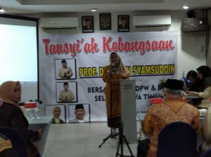 Sebelum Din Syamsuddin, menyampaikan ceramah kebangsaan, sejumlah pengurus Partai Pelita Jatim menyampaikan sambutan. Diantaranya, Ketua DPW Jatim, Nur Cholifah Anis, Motivator Partai Pelita Jatim, M Darwis Sornarto, S.IP., serta Ketua Panitia Penyelenggara ‘Taushiah Kebangsaan’, Yuli Astuti Handayani. (bw)