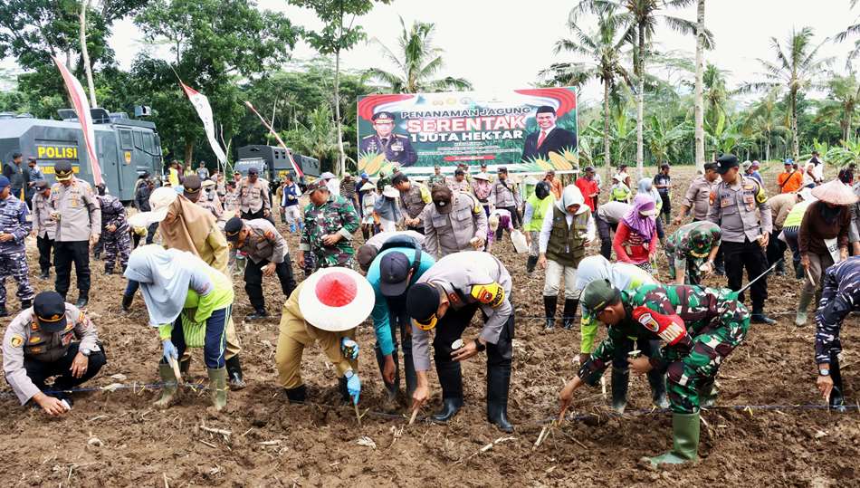 Tanam jagung massal itu merupakan bagian penanaman serentak di Indonesia yang dikomandoi Kapolri Jenderal Pol. Listyo Sigit Prabowo. Sebelum penanaman jagung, digelar zoom bersama Kapolri dan Menteri Pertanian Amran Sulaiman. (udi)