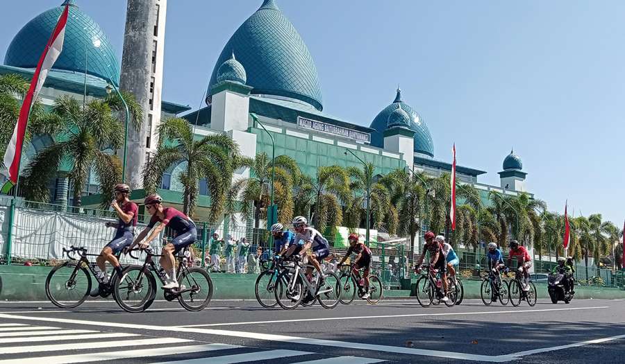 Pembalap Tour de Banyuwangi Ijen melintasi Masjid Agung Baiturohman pada etape terakhir, Kamis (25/7/2024). (Foto/udi)