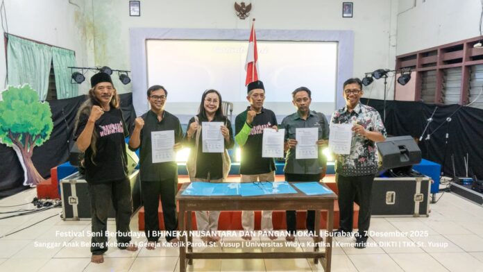 Surabaya, (pawartajatim.com) – Festival Seni Teater di Aula TKK Santo Yusup dan Pangan Lokal di Halaman SMAK Santo Yusup yang digelar Tim Pengabdi Universitas Widya Kartika/UWIKA yang berkolaborasi dengan masyarakat dalam merawat keberagaman, Sanggar Kreatif ‘Anak Belong’ berlangsung ramai dan semarak Sabtu (6/12) malam.