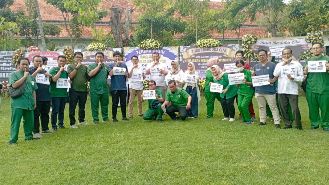 Bahkan, Rektor Unair periode 2001-2006 Prof Dr Med Puruhito juga hadir. Dengan mengenakan baju putih, mereka mempertanyakan keputusan Rektor terkait pemberhentian Prof Bus yang dinilai sepihak dan tidak sesuai prosedur yang ada.