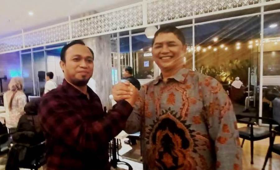 GM PT Indonesia Ferry (ASDP) Ketapang – Gilimanuk, Yani Andriyanto (kiri) bersalam komando dengan GM lama, Samsudin usai kenal pamit, Jumat (16/8/2024). (Foto/udi)