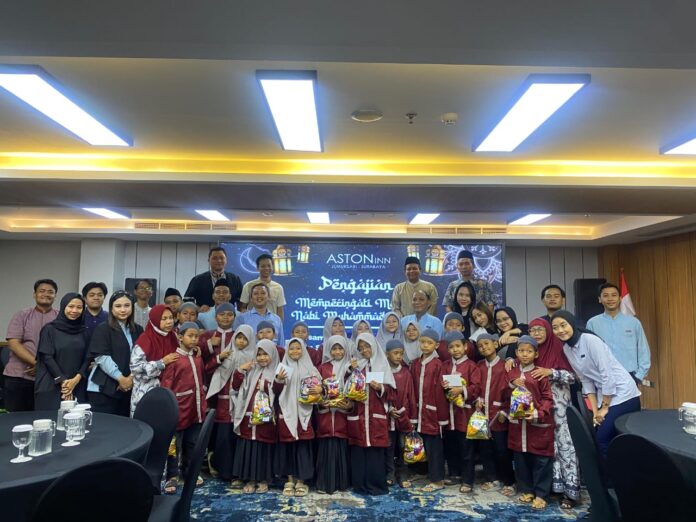Surabaya, (pawartajatim com) – Dalam rangka peringatan Maulid Nabi Muhammad SAW, Aston Inn Jemursari mengundang anak yatim piatu dari Panti Asuhan Al-Kahfi di Jalan Sidosermo Surabaya. Mereka diundang khusus untuk pengajian dan makan malam bersama jajaran manajemen serta karyawan Hotel Aston Inn Jemursari yang terletak di Jalan Sidosermo 70A, Surabaya.