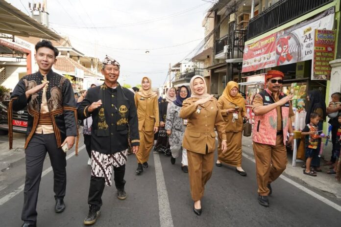 Hj. Lathifah Shohib, jalan kaki bersama peserta kirap warga Kalisongo Dau mengikuti rangkaian “Kirab Budaya Manusuksima sejak dari garis start sebagai penanda dimulainya Kampung Cempluk Festival yang akan berlangsung hingga 11 Oktober mendatang.