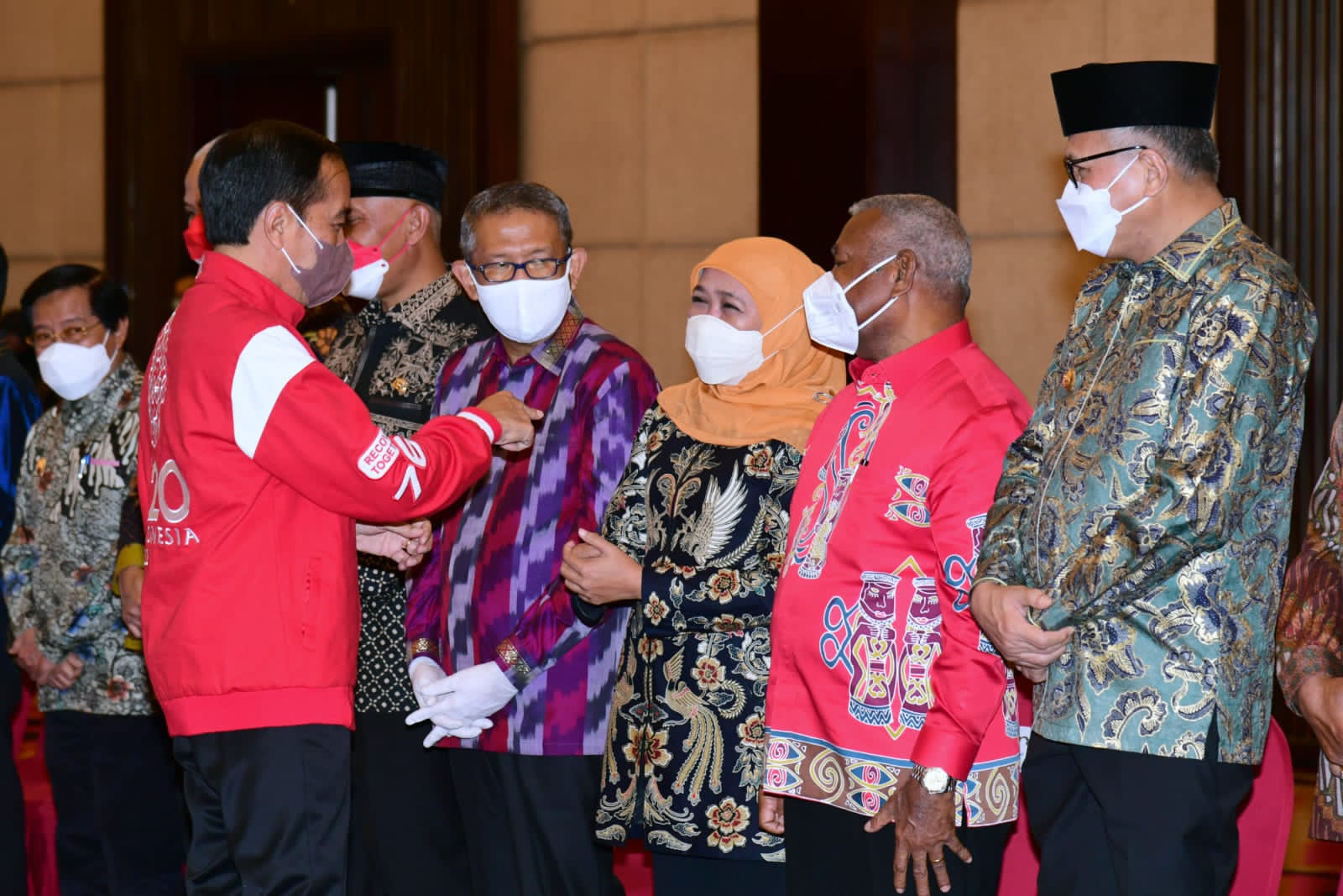 “Dalam penganggaran di APBD Bapak/Ibu ubah tidak seperti pada waktu yang normal dulu, jangan business as usual. APBD harus bisa kita create disesuaikan, kuncinya cuma satu kecepatan kita untuk menyesuaikan,” ujar Presiden. Menanggapi arahan tersebut, Gubernur Khofifah menyatakan kesiapan Jawa Timur melaksanakan seluruh arahan Presiden.