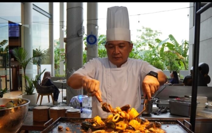 Executive Chef Premier Place, Andy Abidin, sedang live cooking untuk melayani pengunjung. (foto/ist)