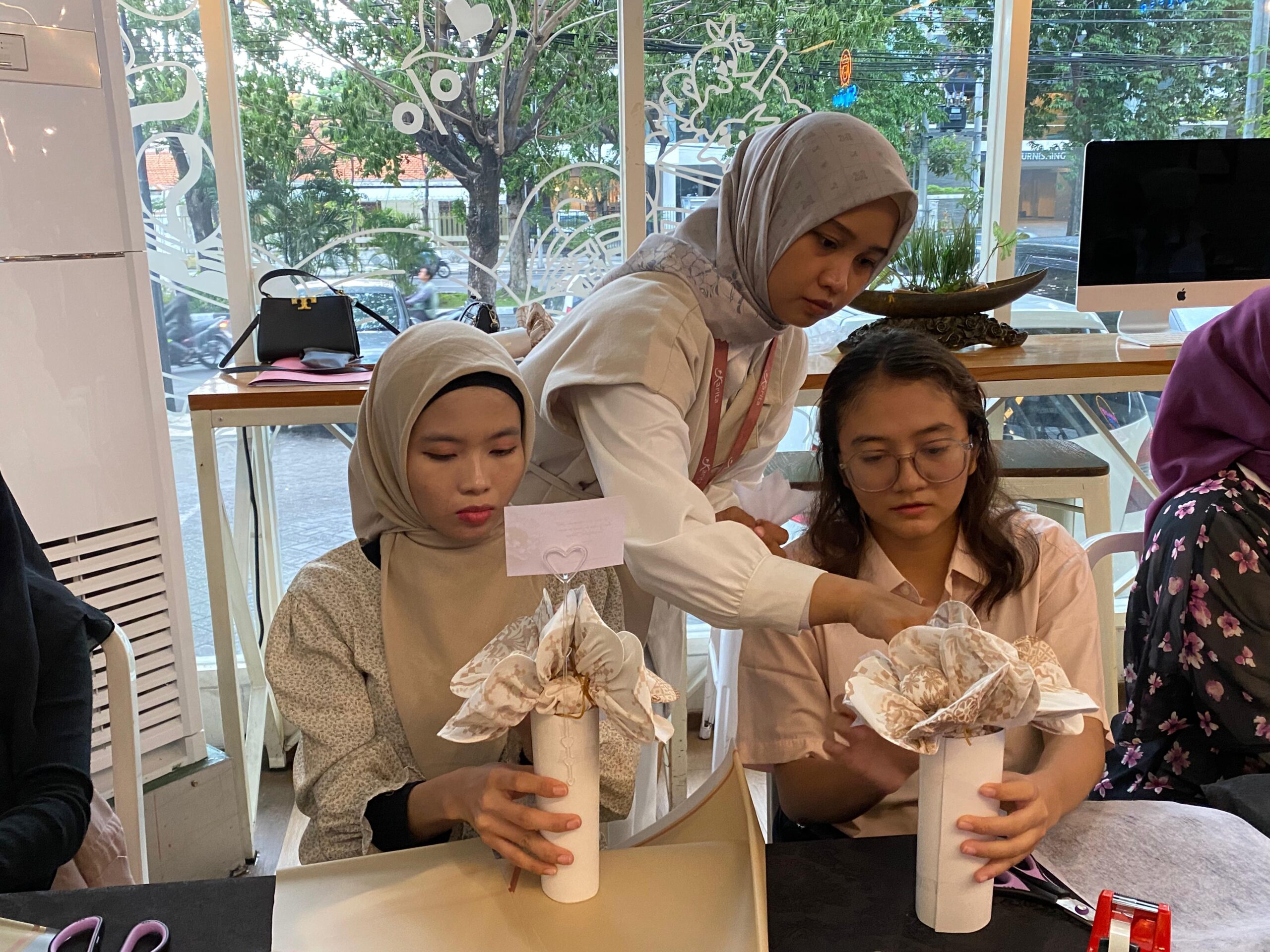 Sambil bersenda gurau para peserta mulai saling mengenal dan meminta tolong satu sama lain untuk mengambil gambar diri mereka saat proses membuat buket hijab. Bahan yang digunakan untuk membuat buket hijab ini dimulai dengan scarf motif perpaduan warna putih serta cokelat, yang di balutkan ke putik yang terbuat dari isian platik/kain yang dilapisi kain spunbon putih, setelah itu dikreasikan menggunakan kertas chelophone, kertas tisu, dan kertas Malaga.