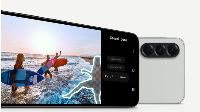 Galaxy A56 5G, Galaxy A36 5G, dan Galaxy A26 5G menghadirkan Object Eraser yang disempurnakan, sehingga pengguna dapat menghapus obyek yang tidak diinginkan dari foto. Mulai dari pejalan kaki atau bayangan yang mengganggu, pengguna dapat secara manual atau otomatis memilih obyek yang akan dihapus.