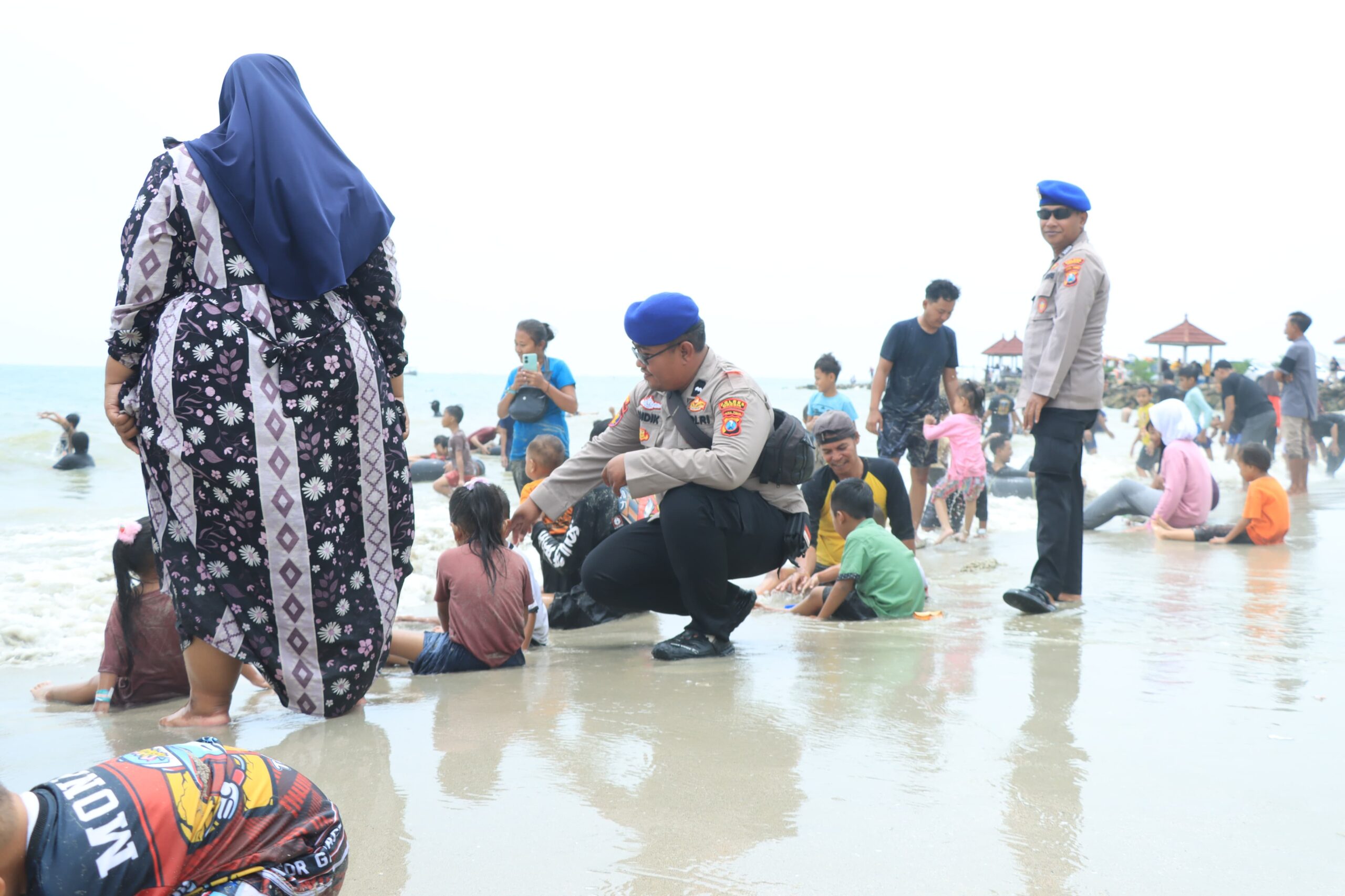 Di lokasi wisata, personel kepolisian dari Polsek Panceng bersama Polres Gresik tampak aktif melakukan patroli dan memberikan edukasi langsung kepada pengunjung. Melalui pengeras suara, petugas mengingatkan para orang tua untuk mengawasi anak-anak saat bermain atau berenang di laut.