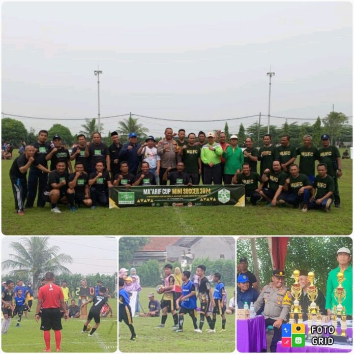 Bukti euforia Mini Soccer Ma’arif Cup 2024, sebelum pertandingan final diadakan pertandingan ta’aruf, Pengurus MWC NU Sukodono, Tomas melawan Kepala MI dan guru olahraga.