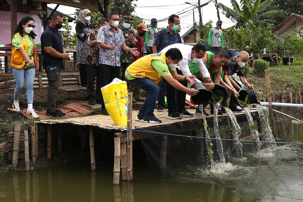 Surabaya, (pawartajatim.com) – Menabur 7.000 benih ikan Nila dan tanam pohon Alpukat di bozem Jemur Wonosari, dilakukan Wali Kota Surabaya Eri Cahyadi, bersama PT Matahari Sakti, Komunitas Lions Club Surabaya (LCS) Shining, Kelompok Tani Minasari dan jajaran camat serta lurah menabur Kamis (20/1). Tebar benih ikan ini bagian dari kolaborasi antara Pemerintah Kota/Pemkot Surabaya dengan pihak swasta untuk menggerakkan perekonomian pasca pandemi Covid-19.