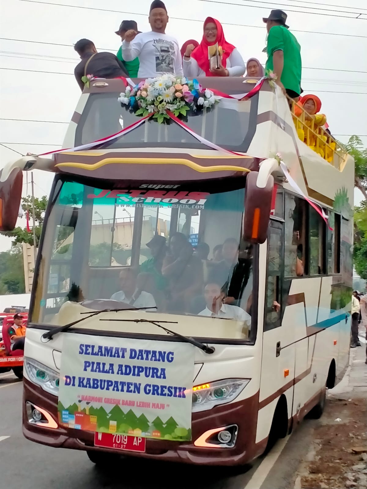Gresik, (pawartajatim.com) – Bupati Gresik Fandi Akhmad Yani dan Wakil Bupati Aminatun Habibah bersama jajaran melakukan kirab menyambut Piala Adipura yang diterima dari Kementerian Lingkungan Hidup dan Kehutanan (KLHK), Selasa (4/3). Diiringi sambutan masyarakat yang luar biasa, mereka memulai kirab dari Tugu Selamat Datang Kabupaten Gresik menggunakan Bus Wisata Grissee.