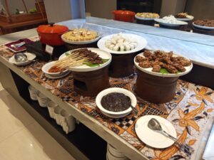 Seperti bistik daging, aneka botok, macam-macam sayur, tahu campur, lontong balap, sate kerang. ditambah kue tradisional seperti klepon, nogosari, aneka cookies, buah segar, salad, kurma, es cream, coklat, dan masih banyak lagi.