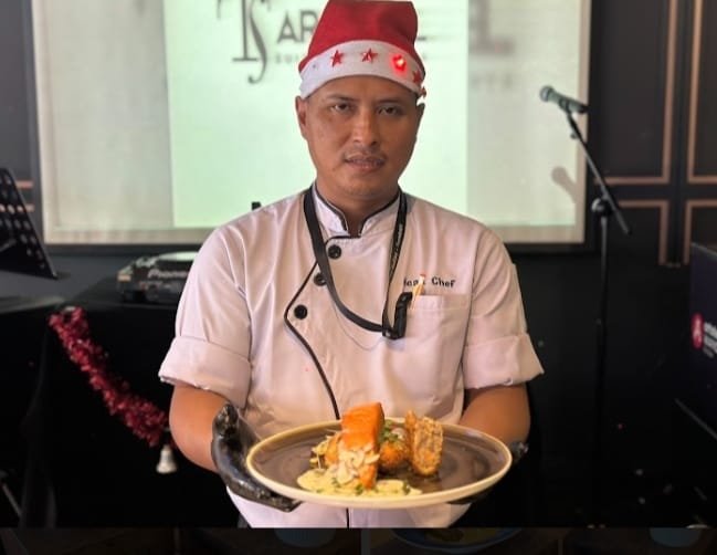 Head Chef ARTOTEL TS Suites Surabaya sedang menunjukkan menu masakan yang dibuatnya secara khusus. (foto/ist)