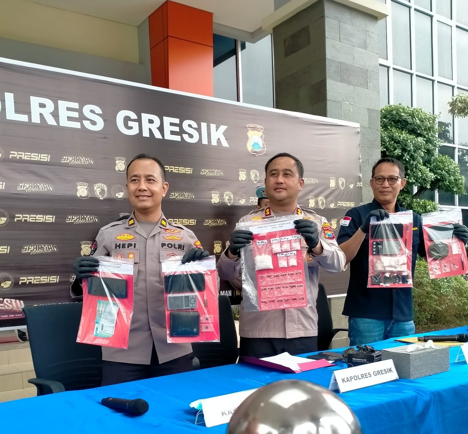 Polres Gresik berhasil mengamankan total 68,211 gram sabu yang terbagi dalam 25 paket siap edar. Selain narkotika, petugas juga menyita timbangan digital/elektrik. Sejumlah unit handphone yang digunakan untuk transaksi. Kartu debit dan uang tunai hasil penjualan.