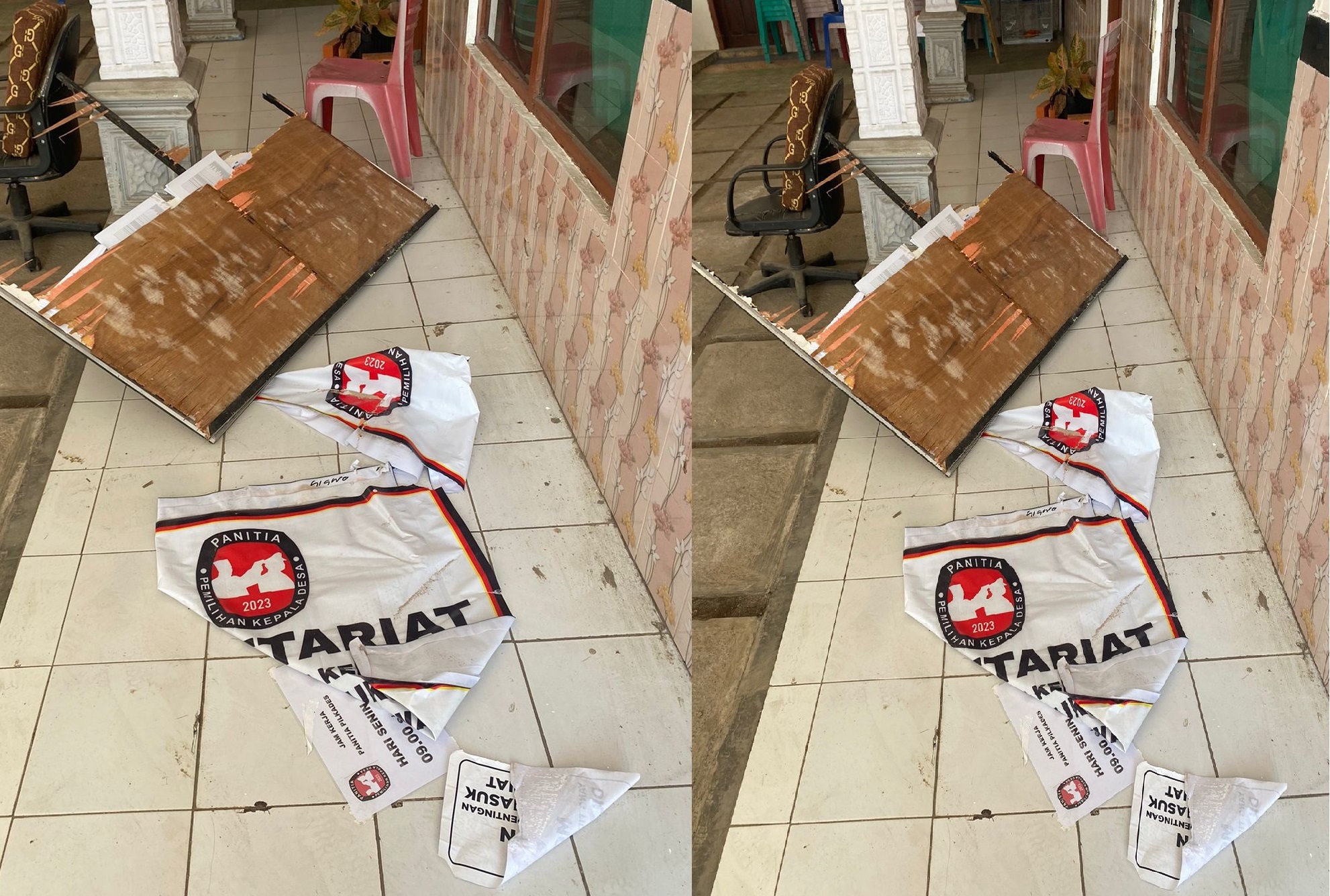 Sejumlah perabot yang dirusak salah satunya papan pengumuman berisi daftar pemilih tetap (DPT). Pelaku merusak kertas pengumuman berisi daftar pemilih. Papan terbuat dari triplek ambruk dan acak-acakan.