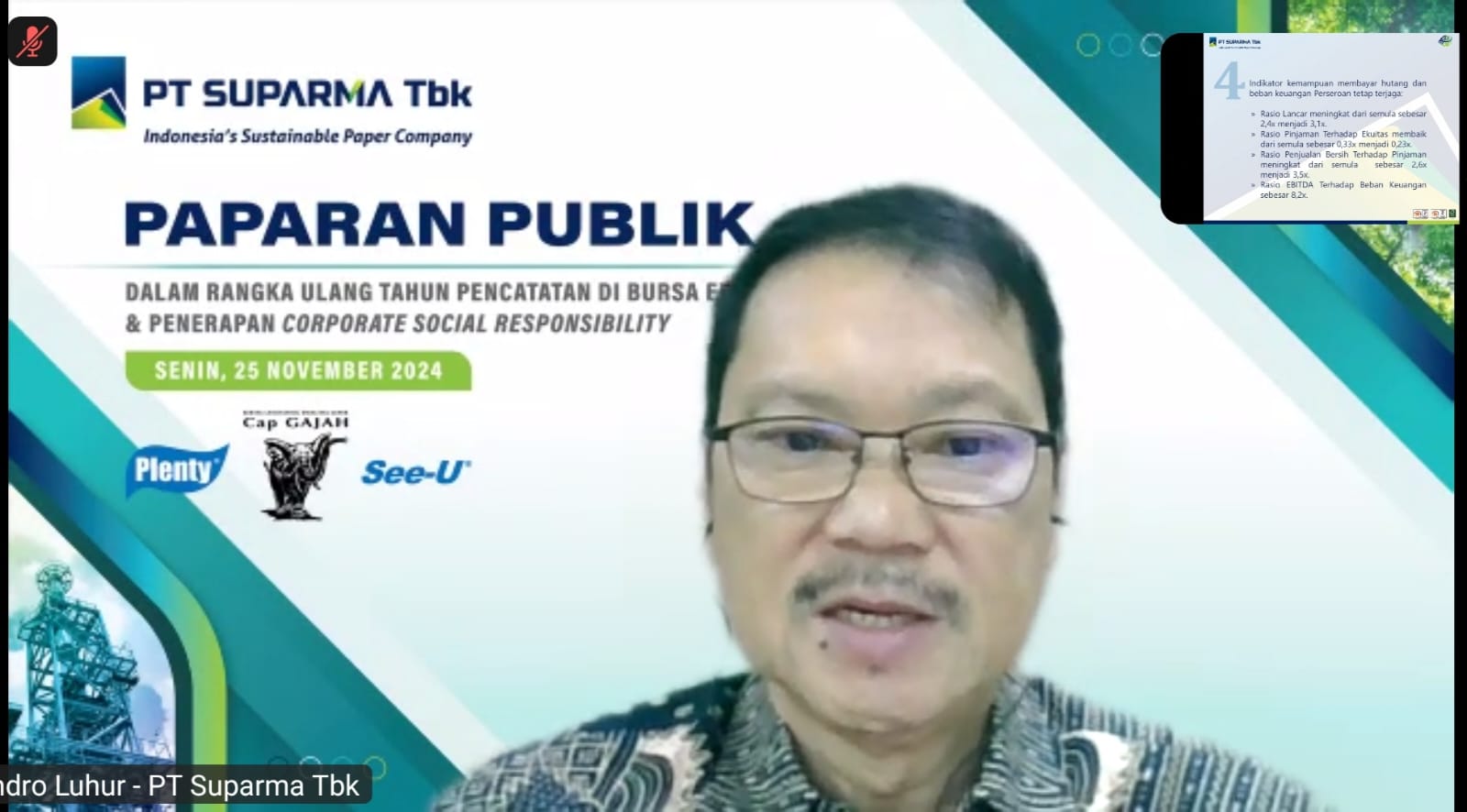 Dalam RUPS tersebut, Hendro juga memaparkan bahwa penjualan bersih PT Suparma selama periode sembilan bulan yang berakhir pada 30 September 2024 mengalami kenaikan tipis sebesar 0,5 persen dibandingkan periode yang sama di tahun sebelumnya. Hal ini didorong oleh peningkatan kuantitas produk kertas sebesar 4,6 persen.