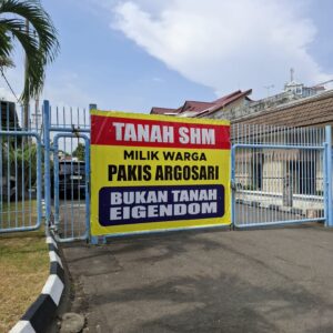 Misalnya, kata Aji, spanduk berukuran sekitar 1,5 meter X 1,5 meter yang dipasang warga di pintu pagar penutup jalan di kawasan perumahan elit Jalan Pakis Argosari II Surabaya (depan perumahan elit Darmo Hill) bertuliskan ‘Tanah SHM Milik Warga Pakis Argosari Bukan Tanah Eigendom’ sudah hampir 15 hari dipasang warga setempat.