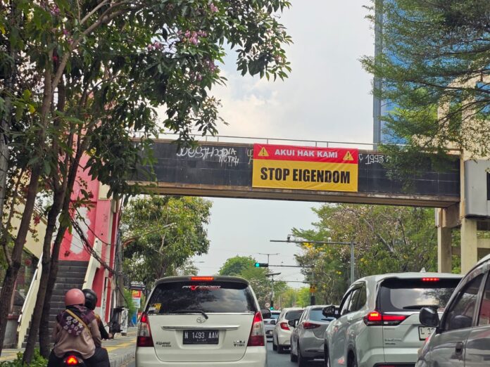 Spanduk bertuliskan 'Akui Hak Kami Stop Eigendom’ terpasang di Jalan Mayjen Sungkono. (foto/bw)
