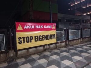 Spanduk itu bertuliskan ‘Akui Hak Kami Stop Eigendom’. Bagi warga Surabaya yang melintas di jalan itu, tentunya sudah mengetahui permasalahan penyerobotan tanah warga oleh Pertamina dengan dalih tanah eigendom verponding/EC 1278 adalah milik BUMN itu.