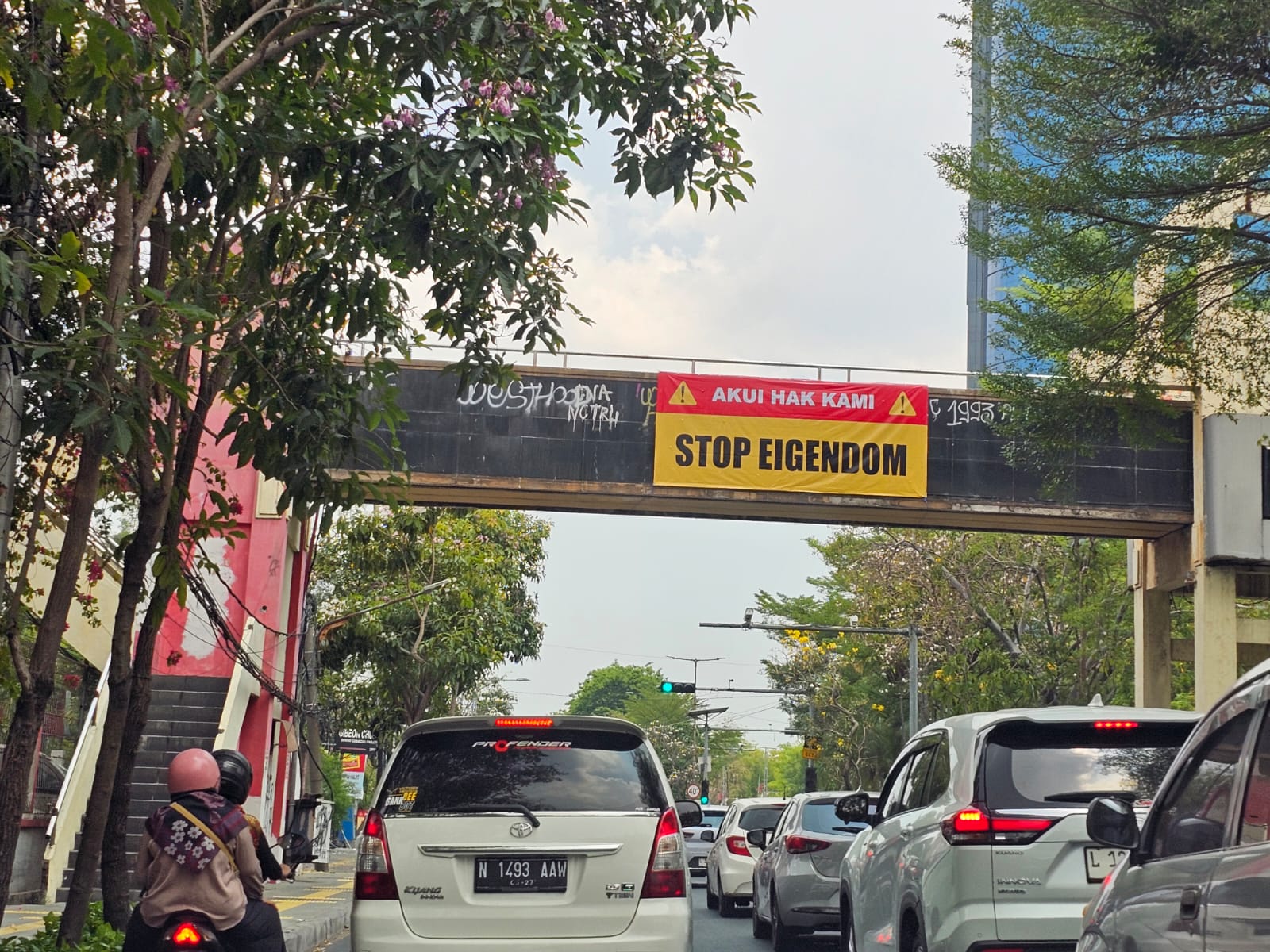 Spanduk itu bertuliskan ‘Akui Hak Kami Stop Eigendom’. Bagi warga Surabaya yang melintas di jalan itu, tentunya sudah mengetahui permasalahan penyerobotan tanah warga oleh Pertamina dengan dalih tanah eigendom verponding/EC 1278 adalah milik BUMN itu.