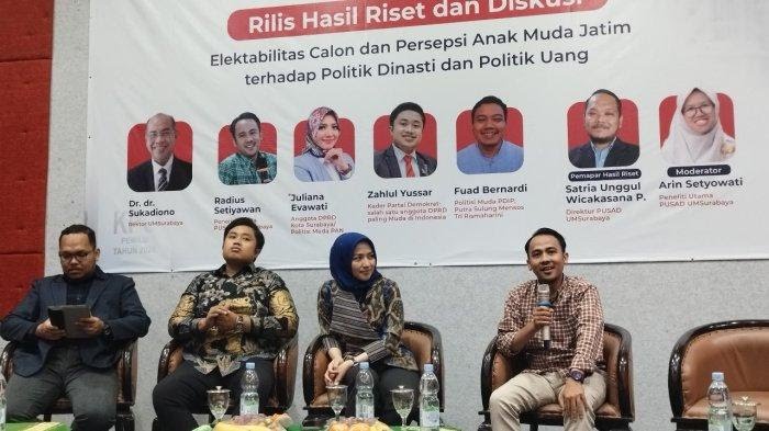 Surabaya, (pawartajatim.com) – Pusat Studi Anti Korupsi dan Demokrasi (PUSAD) Universitas Muhammadiyah (UM) Surabaya melakukan survei. Hasilnya, sebanyak 33 persen pemilih muda di Jawa Timur (Jatim) menolak politik dinasti.