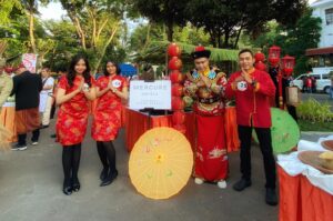 Suasana oriental yang cukup kental sudah mulai terlihat dari dekorasi bunga sakura, lampion, dan payung kertas yang menghiasi meja untuk presentasi rujak uleg, semakin meriah lagi dengan kostum yang didominasi dengan warna merah oleh peserta dari hotel yang berada di Jalan Raya Darmo ini.