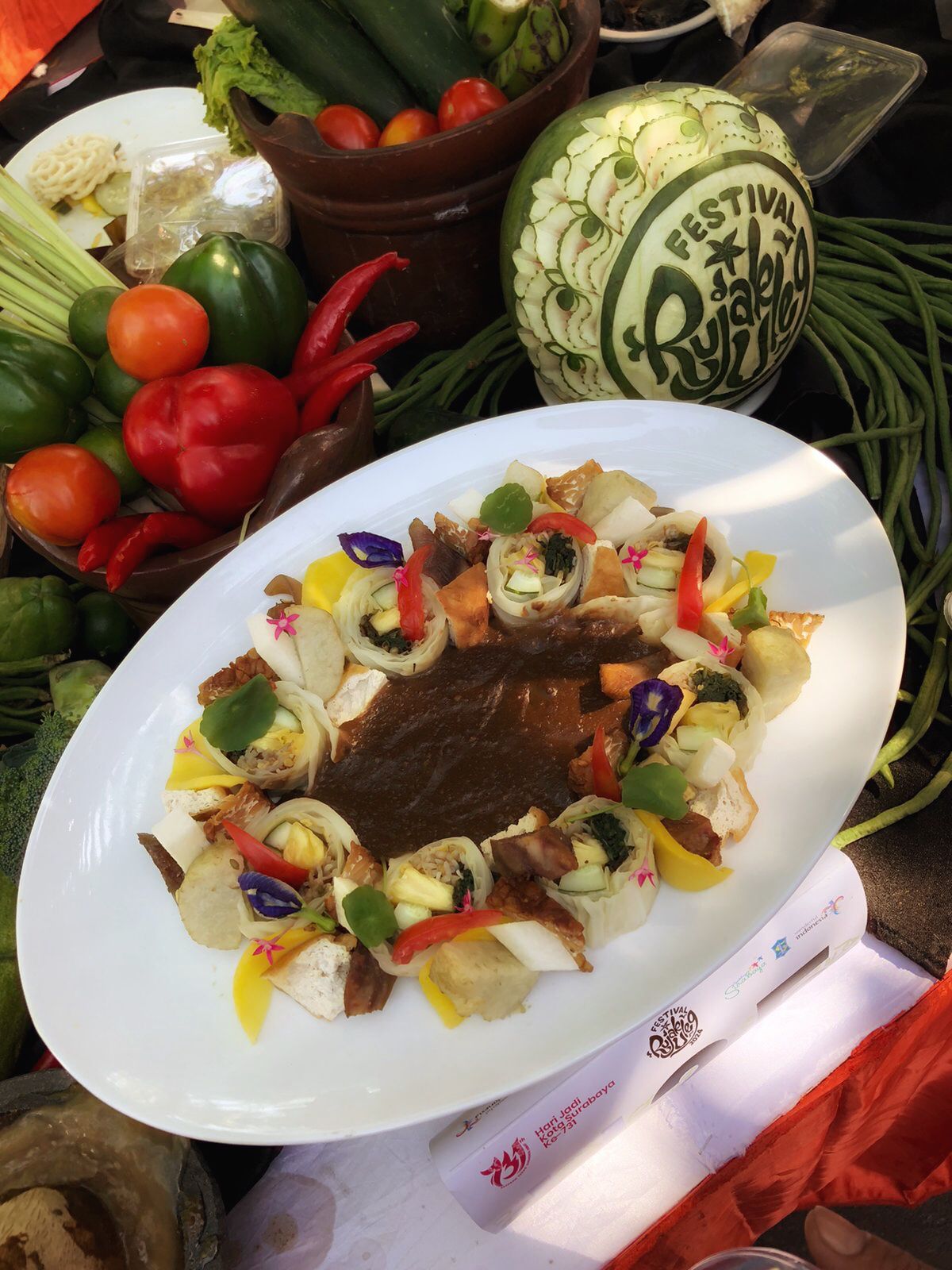 Tema yang diangkat, kental dengan nuansa asia, jadi presentasi plating pun dibikin seperti sushi. Bukan memakai nasi, tapi kubis sebagai kulit terluar sushi, ditambah nanas, timun, sayuran, dan menu lain dalam rujak dijadikan isi tengahnya.