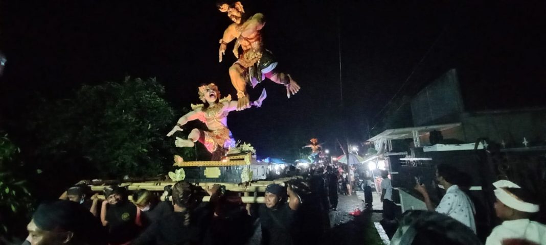 Setelah matahari terbenam, sejumlah Ogoh-ogoh mulai diarak. Karena pandemi, mengarak Ogoh-ogoh hanya digelar di pura masing-masing. Biasanya dikumpulkan dalam satu kecamatan. “Ini puncak rangkaian perayaan Nyepi. Kami mengarak Ogoh-ogoh berkeliling kampung. Ritual ini sebagai simbol agar pengaruh jahat tidak mengganggu selama catur brata penyepian,” kata Budi Wiriyanto, Tokoh Pemuda Hindu di Kecamatan Muncar.