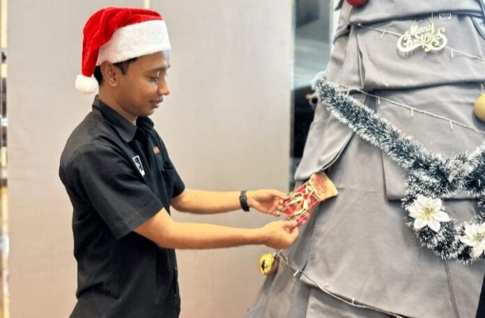 Sidoarjo, (pawartajatim.com) – Menyambut Natal tahun ini, Hotel Neo+ Waru Sidoarjo kembali menghadirkan sentuhan kreativitas melalui dekorasi khas yang berbeda dari tahun-tahun sebelumnya. Tim Housekeeping hotel menciptakan Pohon Natal unik yang seluruhnya disusun dari bed runner, sebuah kreatifitas sederhana, namun penuh makna yang menggabungkan unsur estetika dan nilai keberlanjutan.