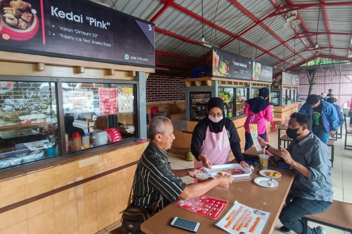 Pengelola Kedai Pink, Putri Della menyajikan pesanan Dimsum dan minuman freshy Ice Tea. (foto/dra)