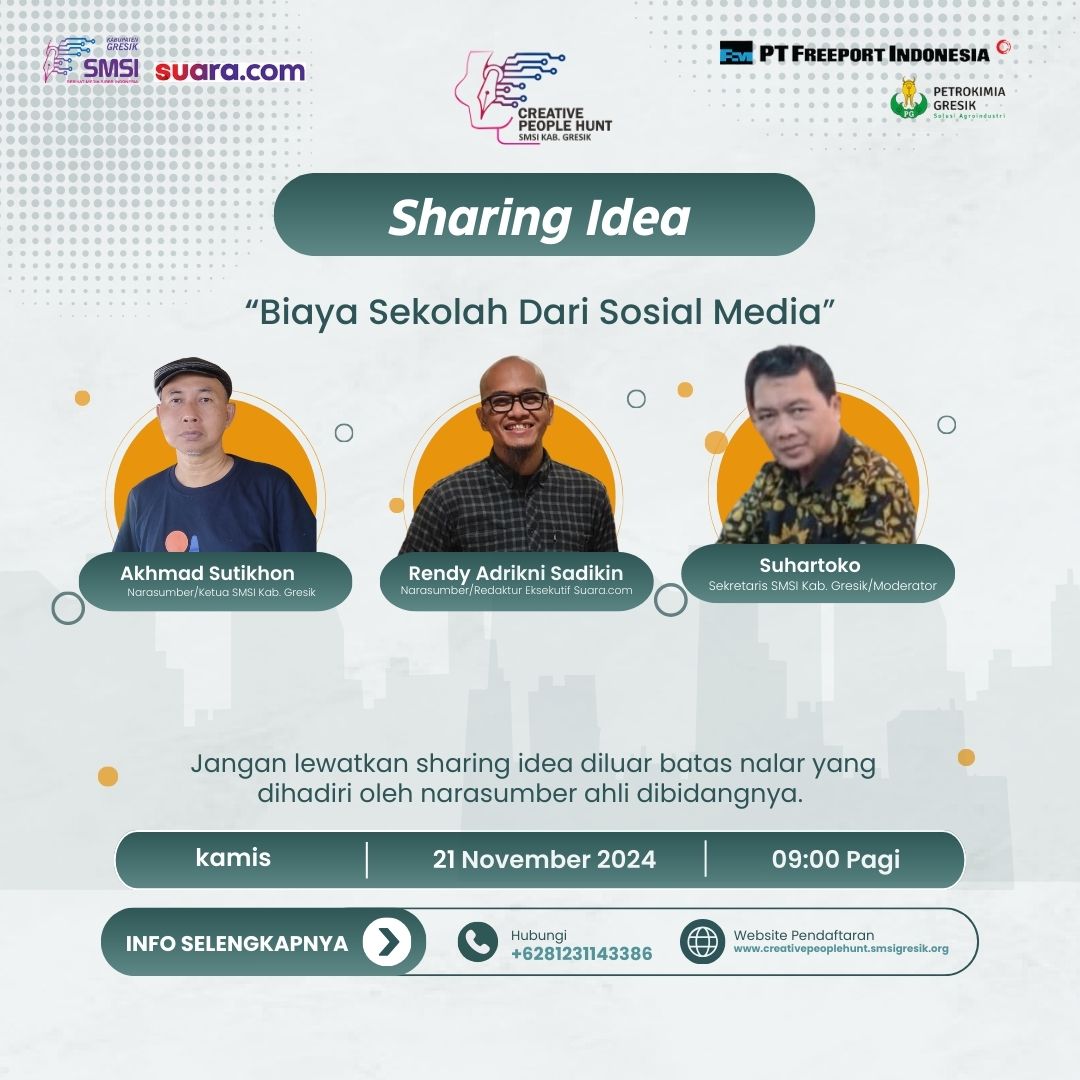 “Rencananya, launching Creative People Hunt ini akan dihadiri Plt Bupati Gresik Bu Min (Aminatun Habibah, Red) dan Pak Kepala Dinas Pendidikan Jatim,” tambah Cak Sholeh. Sementara Ketua SMSI Gresik, Akhmad Sutikhon, menguatkan, dalam program Creative People Hunt ini, tahap pertama akan diambil 10 sekolah yang dinilai layak.