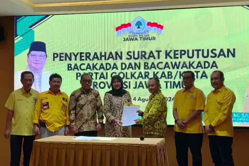 “SK DPP Partai Golkar tentang pasangan bacakada dan bacawakada dari Kabupaten Banyuwangi, yakni saudari Ipuk Fiestiandani Azwar Anas sebagai cabup dan Mujiono sebagai cawabup dari Partai Golkar,” kata Sarmuji membacakan SK.
