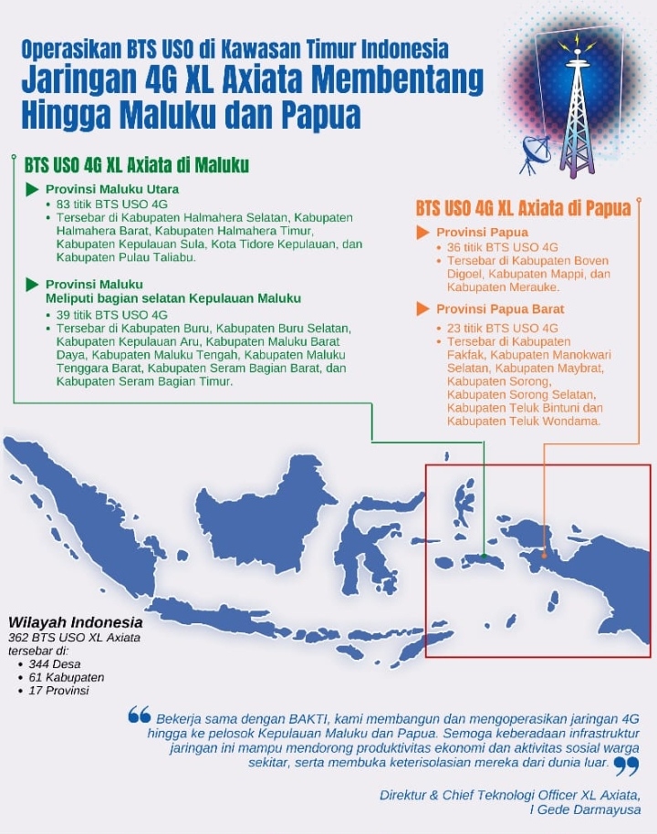 Direktur & Chief Teknologi Officer XL Axiata, I Gede Darmayusa mengatakan, memanfaatkan program USO, kami berupaya untuk turut menyediakan jaringan 4G hingga area-area pelosok di 14 kabupaten yang berada di Kepulauan Maluku yang sangat luas, mulai Halmahera di Utara, Maluku Tengah, hingga Kepulauan Aru di Selatan.